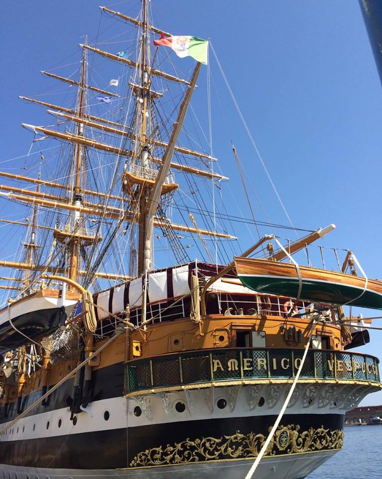 Tappa campana che ha inizio il 28 giugno, quando la nave è apparsa – super attesa – nel golfo. Dal 29 al 1 luglio è stato poi possibile salire a bordo per visitarla. L’attesa è stata considerevole e il caldo non si è certo risparmiato, ma la visita ripaga ogni fatica. Salire sull’Amerigo Vespucci è per il visitatore un affaccio nel mondo di chi del mare ha fatto la propria casa: il legno lucido, la struttura massiccia del timone e dei ponti, le ampie vele e le corde spesse sono dettagli ricchi di fascino e mistero, quasi una magia. A sottolinearne la storia e la bellezza, la mostra fotografica sulla Grande Guerra allestita a bordo e il tricolore che di sera la illumina tutta, vanto italiano che splende sulla costa.